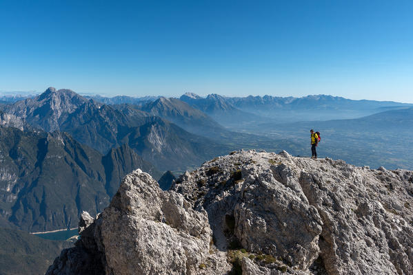 Mount Pizzocco, Dolomites, Veneto, Italy. Mountaineer on the summit of Pizzocco, National Park Dolomiti Bellunesi