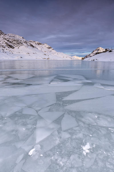Geometric ice forms below the glass area formed after a partial thaw in the clear waters of White Lake. Bernina Pass. Canton of Graubuenden. Engadine. Switzerland. Europe