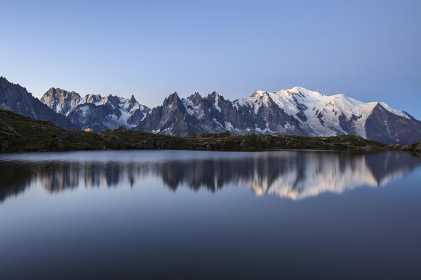 The Mont Blanc mountain range reflected in the waters of Lac de Chesery at sunrise. Haute Savoie France Europe