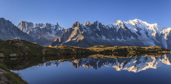 Mont Blanc reflected on Lac de Chesery at sunset. Haute Savoie France Europe