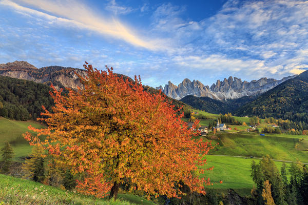 Red cherry trees in autumn color the country road around St.Magdalena village. In the background the Odle Mountains. South Tyrol
