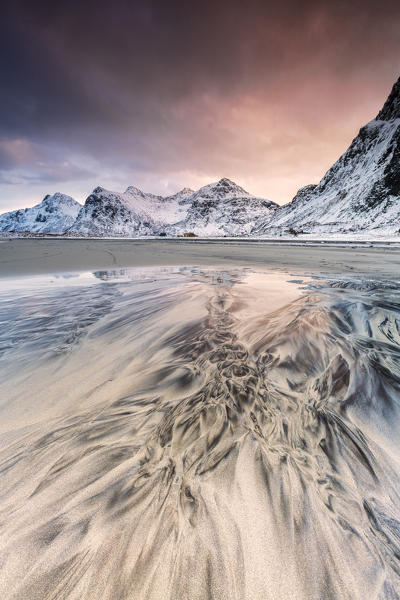 Pink sky on the surreal Skagsanden beach surrounded by snow covered mountains. Lofoten Islands Northern Norway Europe