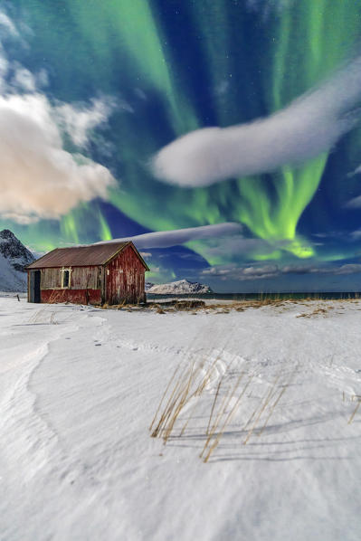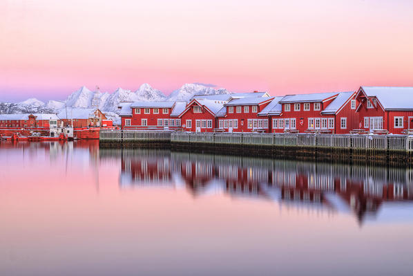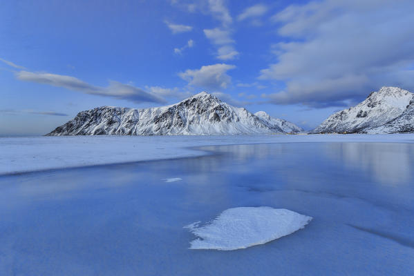 Sunset on Skagsanden beach surrounded by snow covered mountains reflected in the cold sea. Lofoten Islands. Norway Europe