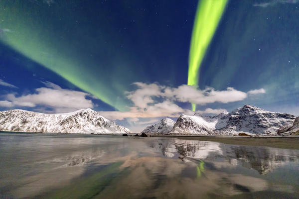 Northern Lights illuminate Skagsanden beach and the snowy peaks. Lofoten Islands Northern Norway Europe