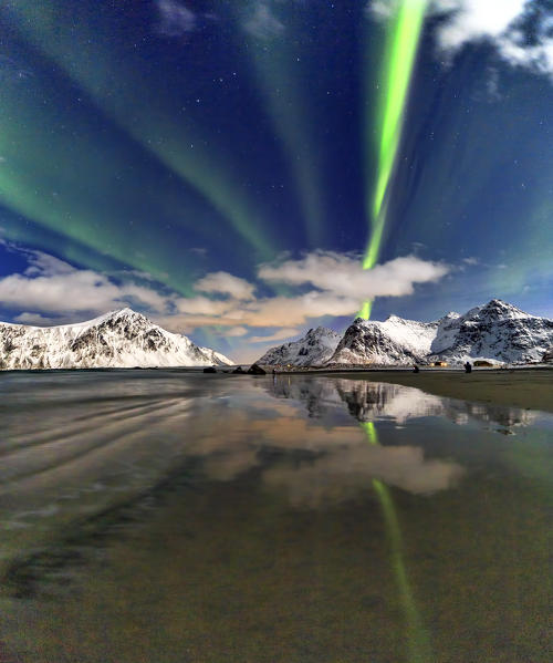 Northern Lights illuminate Skagsanden beach and the snowy peaks. Lofoten Islands Northern Norway Europe