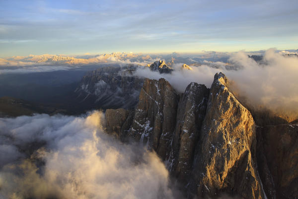 Aerial view of the mountain range of Odle surrounded by clouds. Dolomites Val Funes Trentino Alto Adige South Tyrol Italy Europe