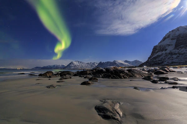 View of the mountains of Gymsøya from Smorten reflected in the clear sea still partially frozen. Lofoten Islands Norway Europe