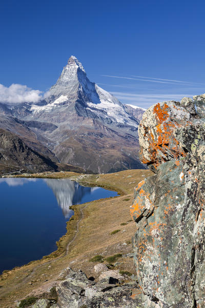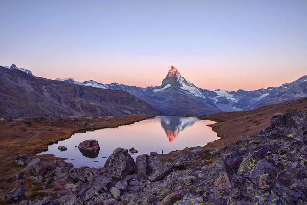The Matterhorn reflected in Stellisee at dusk. Zermatt Canton of Valais Pennine Alps Switzerland Europe