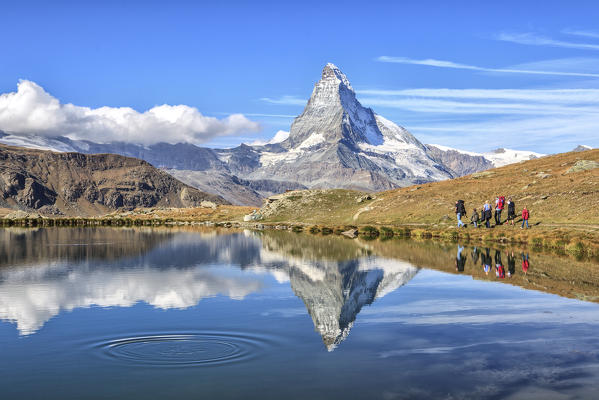 Hikers walking on the path beside the Stellisee with the Matterhorn reflected. Zermatt Canton of Valais Pennine Alps Switzerland Europe