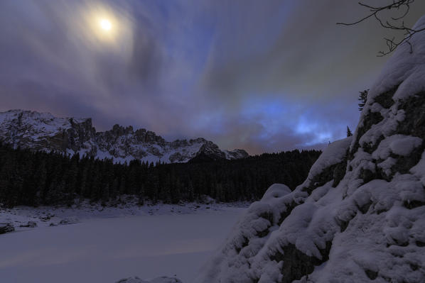 Full moon at Lake Carezza in the background the Latemar group. Ega Valley. Dolomites. Trentino Alto Adige Italy