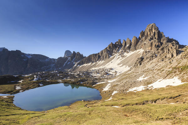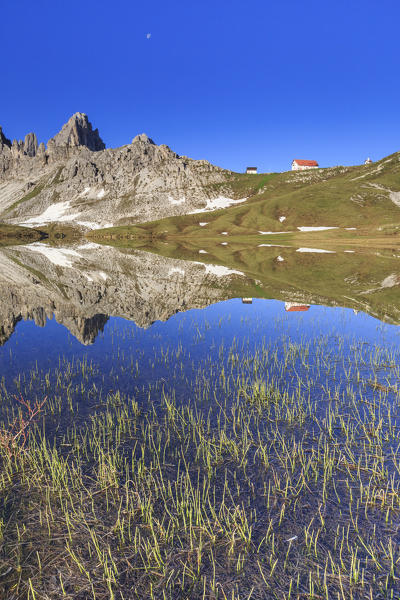 Dawn illuminates the Three Peaks and Mount Paterno reflected in the lake. Sesto Dolomites Trentino Alto Adige Italy Europe