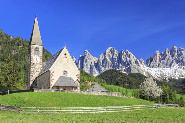 The Church of Ranui and the Odle group in the background. St. Magdalena Funes Valley Dolomites South Tyrol Italy Europe