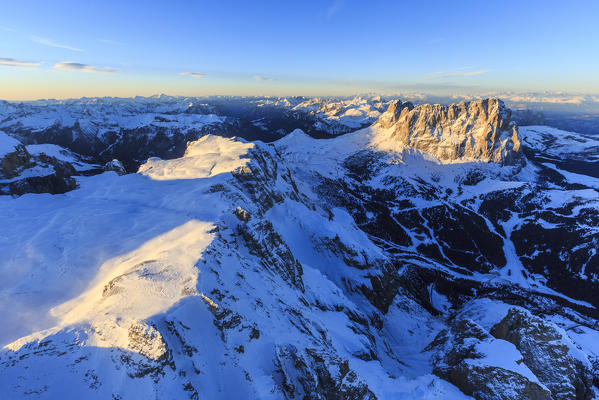 Aerial view of Catinaccio Group and Vajolet Towers at sunset. Sciliar Natural Park Dolomites Trentino Alto Adige Italy Europe
