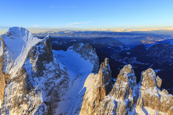 Aerial view of Catinaccio Group and Vajolet Towers at sunset. Sciliar Natural Park Dolomites Trentino Alto Adige Italy Europe
