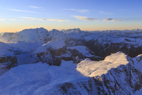 Aerial view of Marmolada Group at sunset. Dolomites Sella Group Trentino Alto Adige Italy Europe