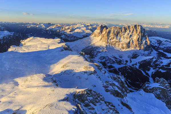 Aerial view of Sassolungo and Grohmann peak at sunset. Dolomites Sella Group Trentino Alto Adige Italy Europe