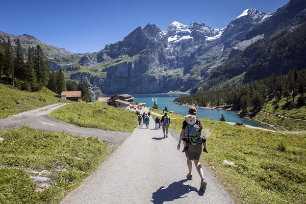 Summer view of Lake Oeschinensee Bernese Oberland Kandersteg Canton of Bern Switzerland Europe