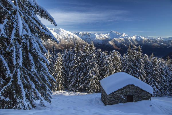 Pink sky at dawn above snow covered huts and trees Tagliate Di Sopra Gerola Valley Valtellina Orobie Alps Lombardy Italy Europe