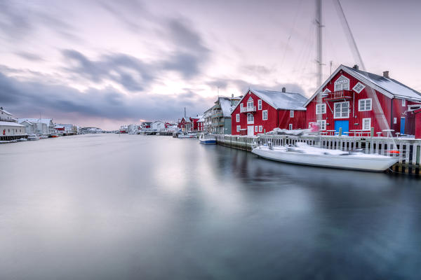 The typical fishing village of Henningsvaer with its red houses called rorbu Lofoten Islands Northern Norway Europe