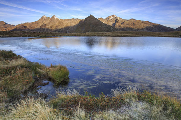 Mount Cardine and Peak Tambò are reflected in Lake Andossi at sunrise Chiavenna Valley Valtellina Lombardy Italy Europe