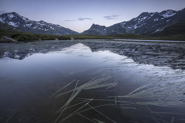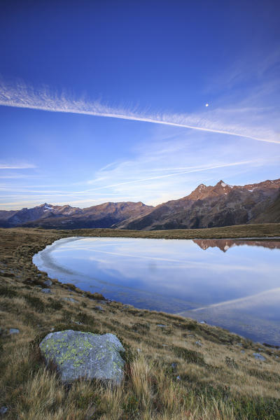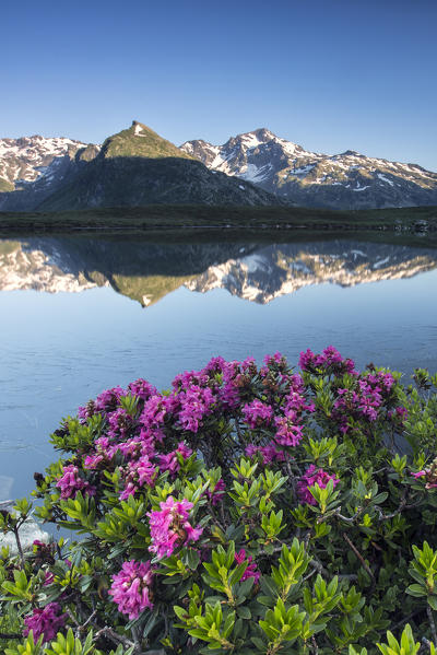Rhododendrons surround Peak Tambò reflected in Lake Andossi at sunrise Chiavenna Valley Valtellina Lombardy Italy Europe