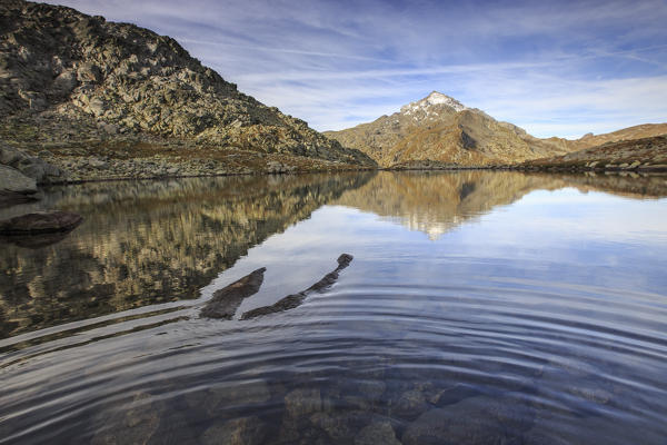 Peak Tambò reflected in Lake Bergsee at dawn Chiavenna Valley Spluga Valley Switzerland Europe