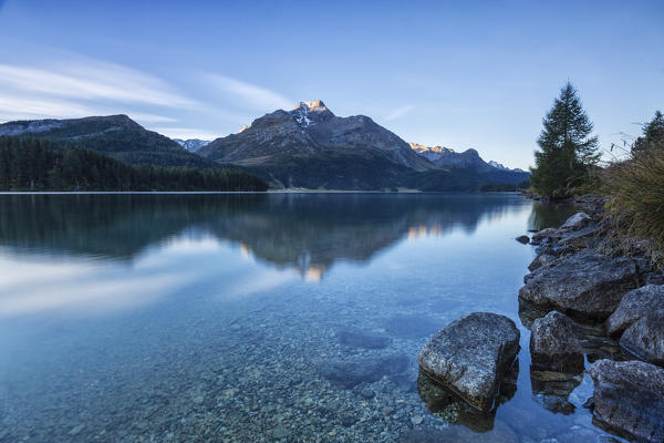 Dawn illuminates the peaks reflected in the calm waters of Lake Sils Engadine Canton of Graubünden Switzerland Europe