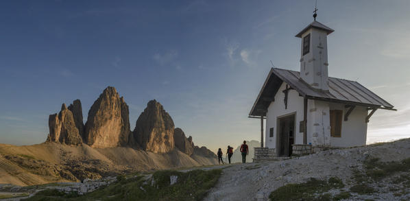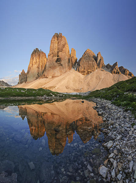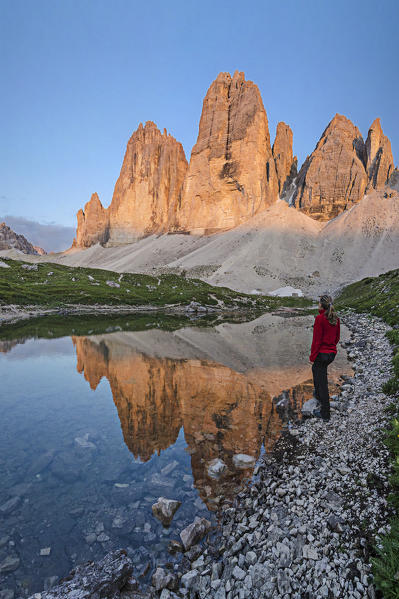 Piana Mount, Drei Zinnen, Three Peaks of Lavaredo, Tre Cime di Lavaredo, Belluno, Dolomites, Veneto, South Tyrol, Italy. Venus Belt behind Three Peaks of Lavaredo.