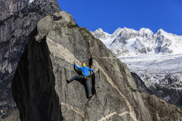 Climber on steep rock face in the background blue sky and snowy peaks of the alps Masino Valley Valtellina Lombardy Italy Europe