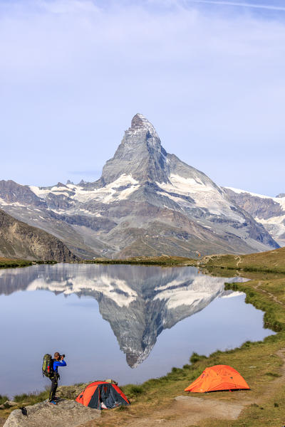 Photographer in action with Matterhorn reflected in Lake Stellisee Zermatt Pennine Alps Canton of Valais Switzerland Europe