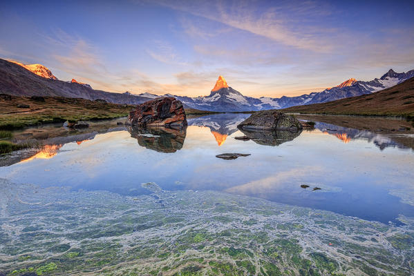 The Matterhorn reflected in Lake Stellisee at dawn Zermatt Pennine Alps Canton of Valais Switzerland Europe
