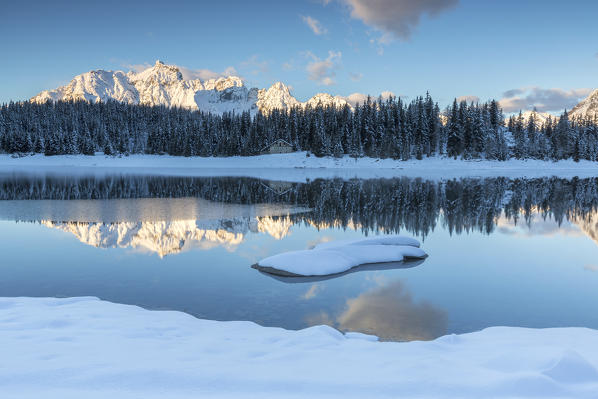 Wooden cabin surrounded by snowy peaks and woods reflected in Palù Lake at dawn Malenco Valley Valtellina Lombardy Italy Europe