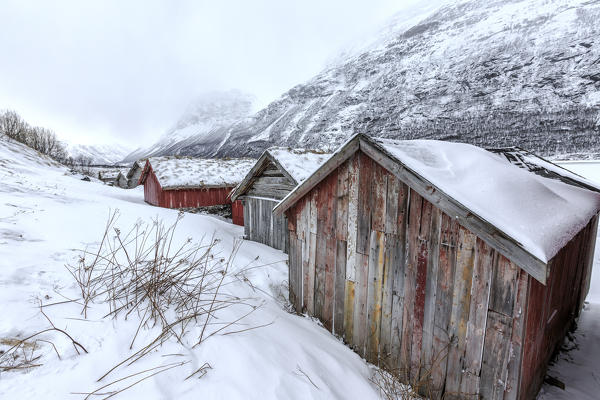 Typical wooden huts in the snowy landscape of Lyngseidet Lyngen Alps Tromsø Lapland Norway Europe