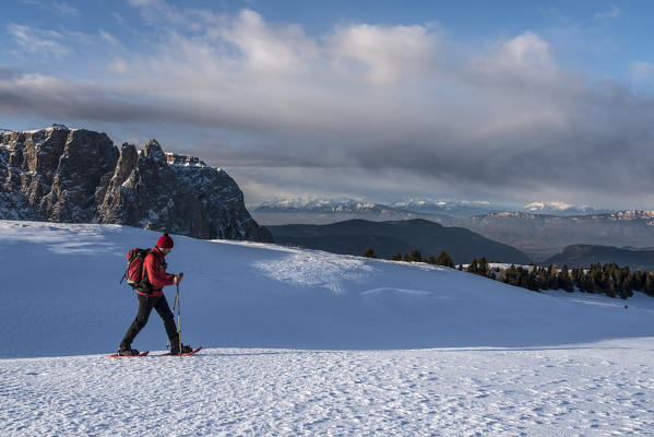 Alpe di Siusi/Seiser Alm, Dolomites, South Tyrol, Italy. Snowshoe hiker on plateau Bullaccia/Puflatsch. In the background the peaks of Sciliar/Schlern