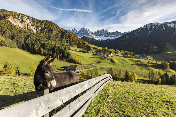 Donkey with the village and Odle Dolomites peaks on the background. Santa Maddalena, Funes, Bolzano, Trentino Alto Adige - Sudtirol, Italy, Europe.