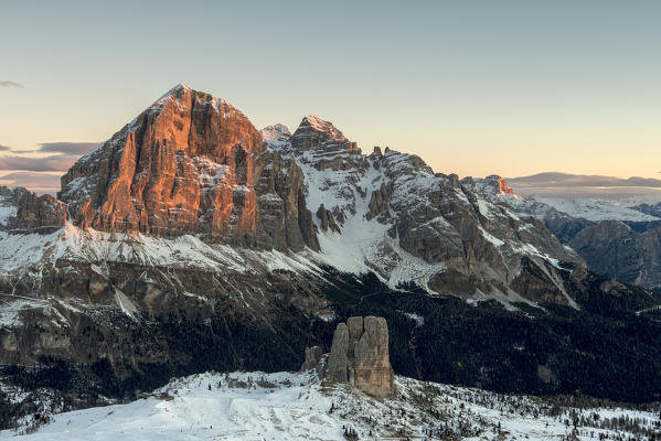 Nuvolau, Dolomites, Veneto, Italy. Alpenglow on the peaks of the Tofane