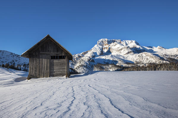 Prato Piazza/Plaetzwiese, Dolomites, South Tyrol, Italy. Winter on the Prato Piazza. In the background the Croda Rossa