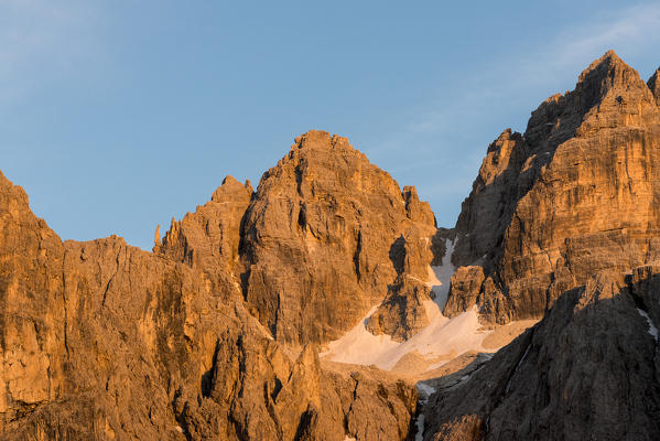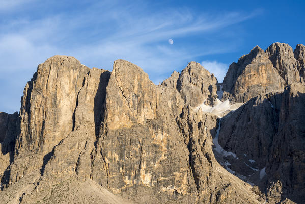 Passo Gardena, Dolomites, South Tyrol, Italy. Mountain hut in front of the mountains of the Sella group