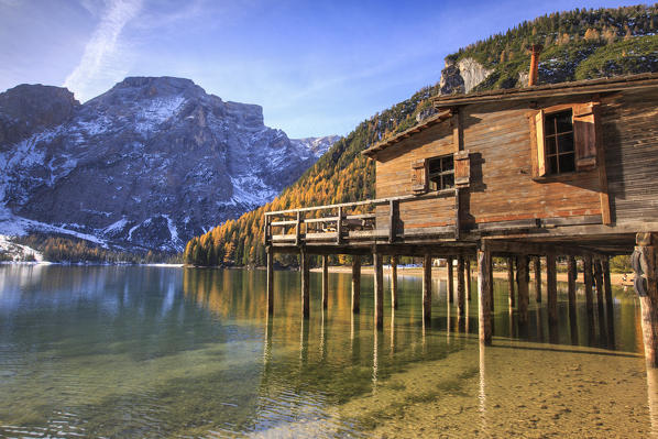Wooden hut in the autumn landscape of Lake Braies Natural Park of Fanes Sennes Bolzano Trentino Alto Adige Italy Europe