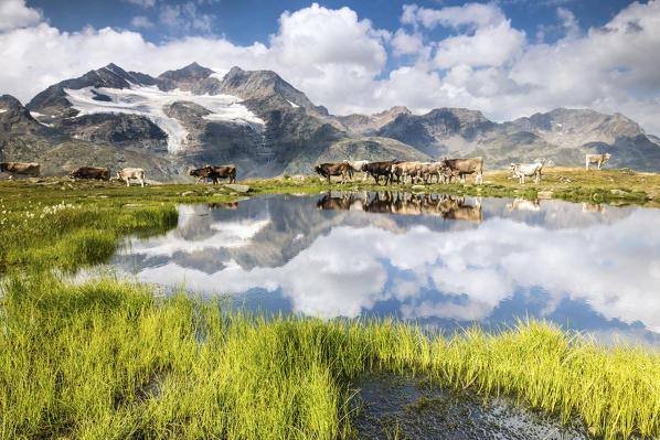 Cows on the shore of the lake where high peaks and clouds are reflected Bugliet Valley Bernina Engadine Switzerland Europe