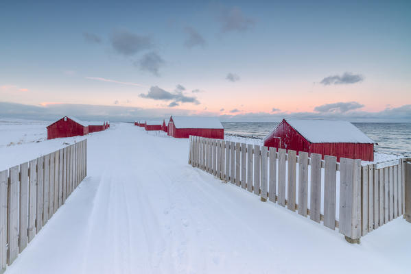 Pink light and snow surround the typical fishermen houses called Rorbu at Eggum Vestvagøy Island Lofoten Islands Norway Europe