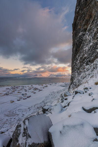 The fishing village surrounded by snow and cold sea under a colorful sky Eggum Vestvagøy Island Lofoten Islands Norway Europe