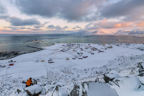 The pink light and the aurora borealis illuminate the snowy landscape on a starry night Strønstad Lofoten Islands Norway Europe