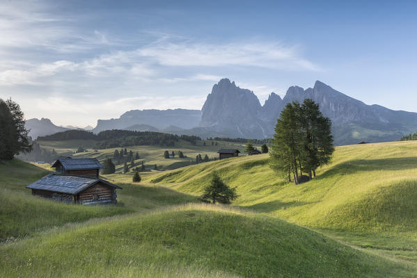 Alpe di Siusi/Seiser Alm, Dolomites, South Tyrol, Italy. Summer landscape on the Alpe di Siusi/Seiser Alm with the peaks of Sassolungo / Langkofel and Sassopiatto / Plattkofel