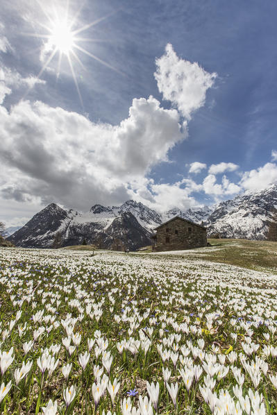 Spring flowering crocus at Alpe Culino in Valgerola with views of the snow covered peaks. Rasura. Valgerola. Orobie Alps. Lombardy. Italy. Europe