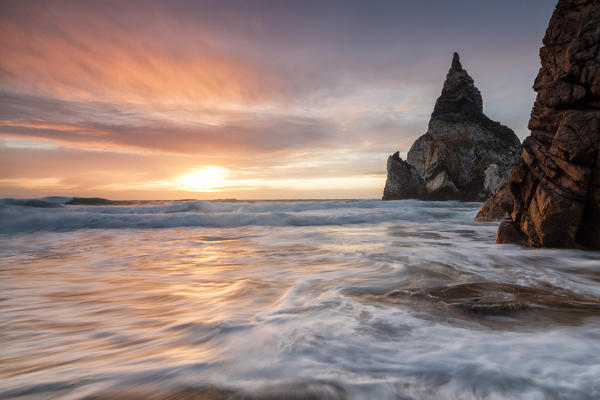 The fiery sky at sunset is reflected on the ocean waves and cliffs Praia da Ursa Cabo da Roca Colares Sintra Portugal Europe