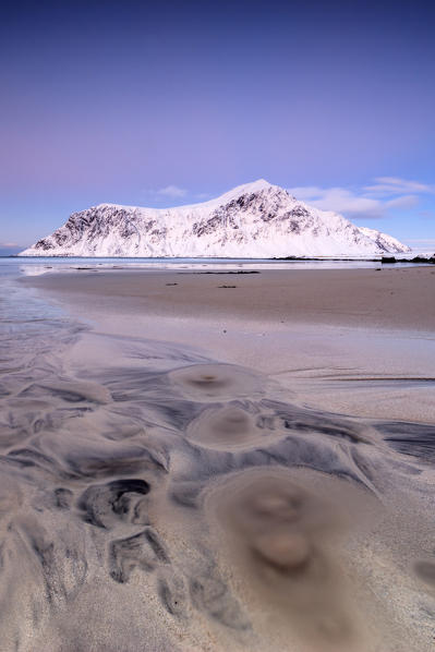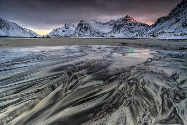 Pink sky and snowy peaks frame the surreal Skagsanden beach at sunset Flakstad Nordland county Lofoten Islands Norway Europe