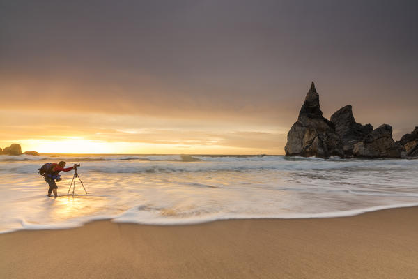 The colors of the sunset on the cape and lighthouse of Cabo da Roca overlooking the Atlantic Ocean Sintra Portugal Europe