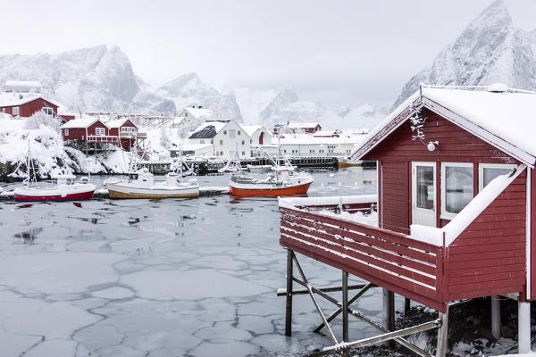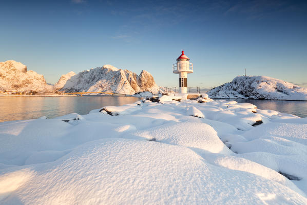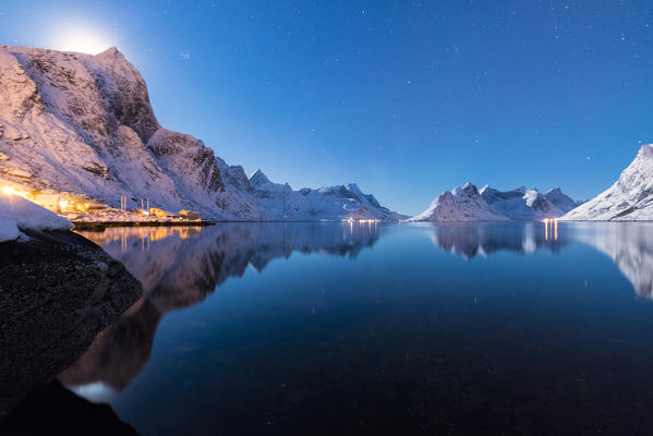 The snowy peaks are reflected in the frozen sea on a starry winter night Reine Bay Nordland Lofoten Islands Norway Europe