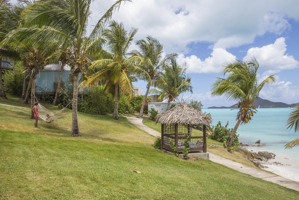 Palm trees and gardens surrounded by Caribbean Sea Ffryes Beach Sheer Rocks Antigua and Barbuda Leeward Island West Indies